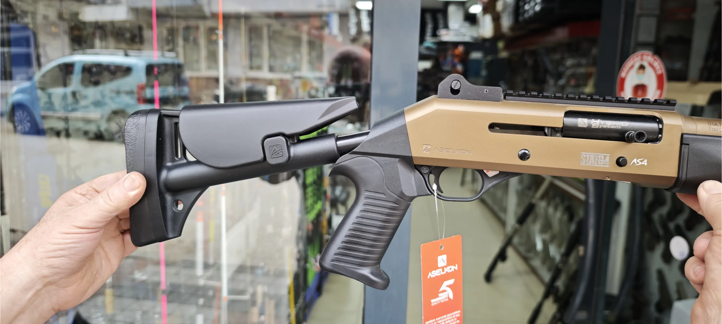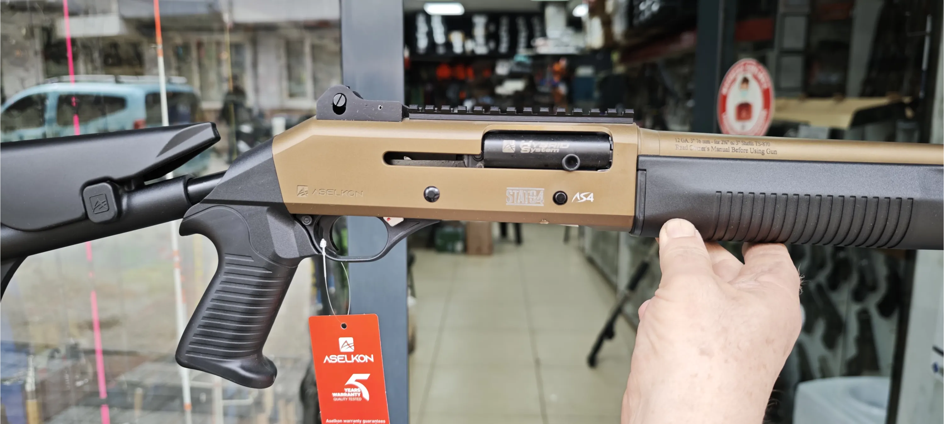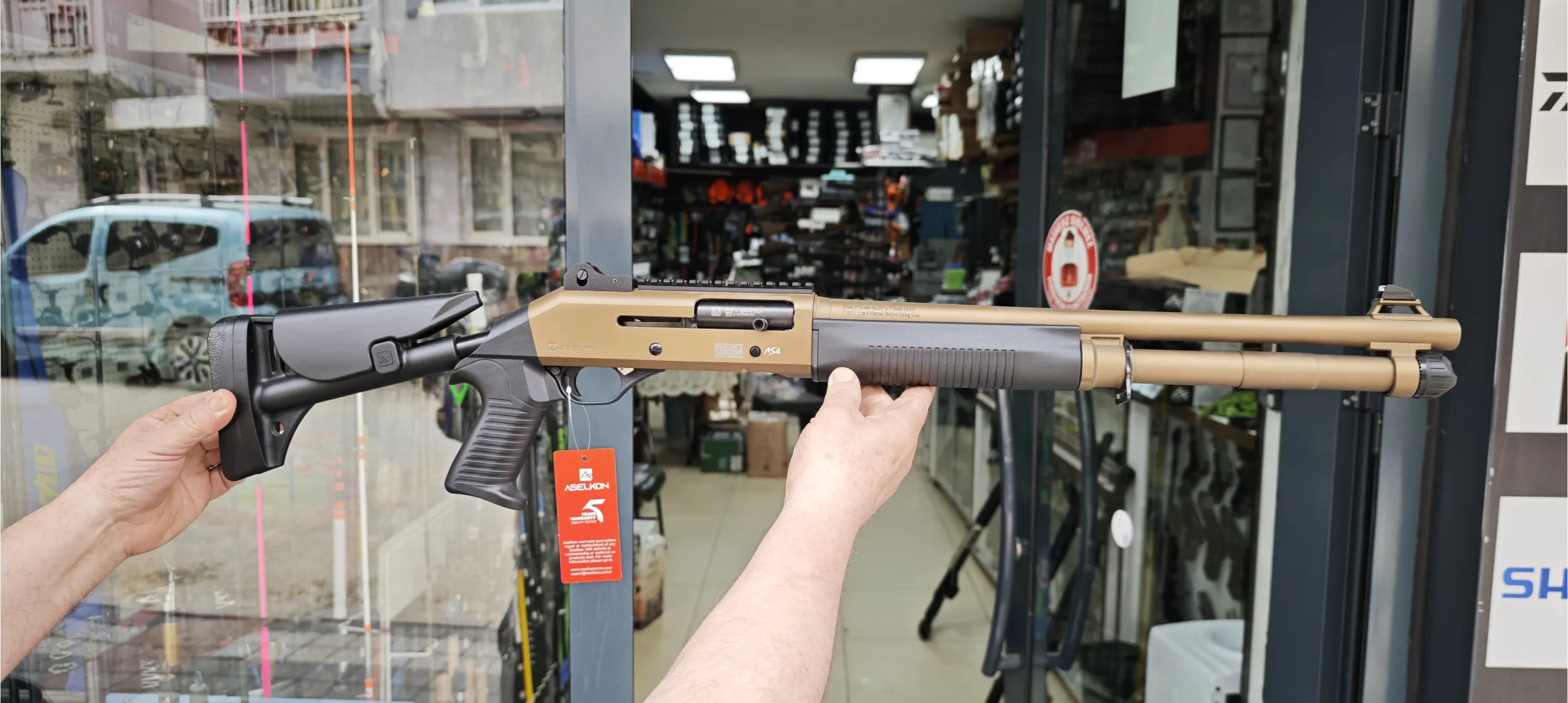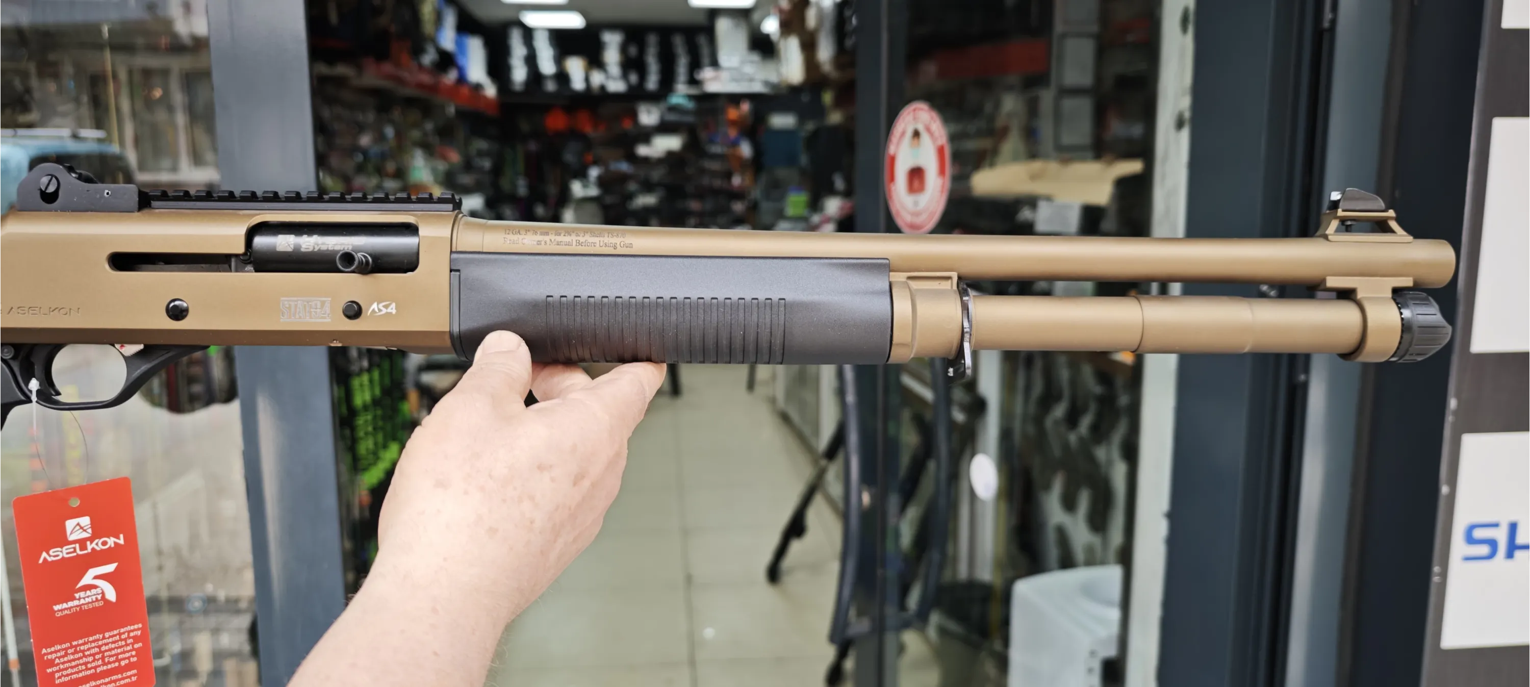 # TEKNİK DETAYLAR • Marka / Model: Aselkon S4 GT Sandstorm • Sistem: Gazlı (Gas Operated) Yarı Otomatik • Kalibre: 12 Kalibre • Fişek Yatağı: 76 mm (3" Magnum) • Gövde Rengi: Sandstorm (Mat Kum Rengi) • Aksesuar Yolu: 22 mm Pikatini Ray • Ağırlık: 3.150 gr (±)