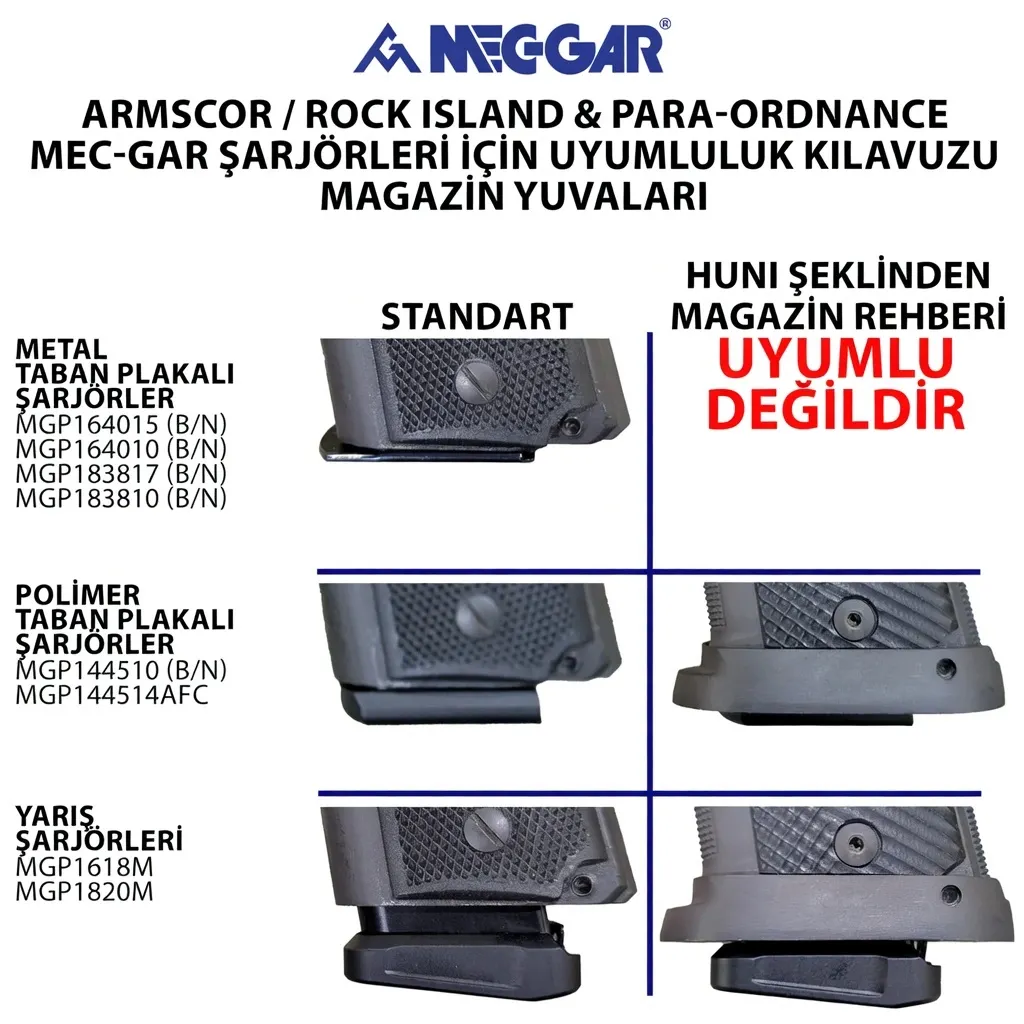 Çift sıra .45 kalibre şarjörler, mermi ağırlığı nedeniyle yay üzerinde yüksek baskı oluşturur. Mec-Gar'ın ısıl işlemli yapısı, bu baskı altında şarjör ağzının (feed lips) zamanla açılmasını engeller. Şarjörünüzün 'drop-free' performansını korumak için, dış yüzeyini her zaman kuru tutunuz ve temizlik yaparken aşındırıcı teller yerine yumuşak bir bez kullanınız. P13 gibi özel bir tabancayı yarı yolda bırakmayacak tek şarjör Mec-Gar'dır.
