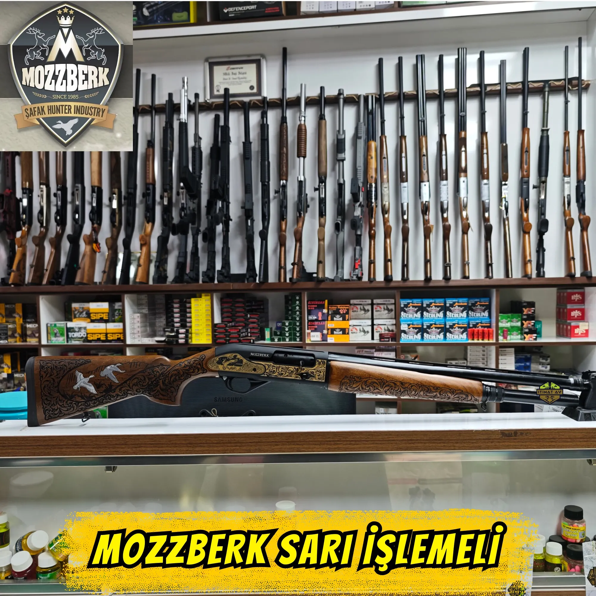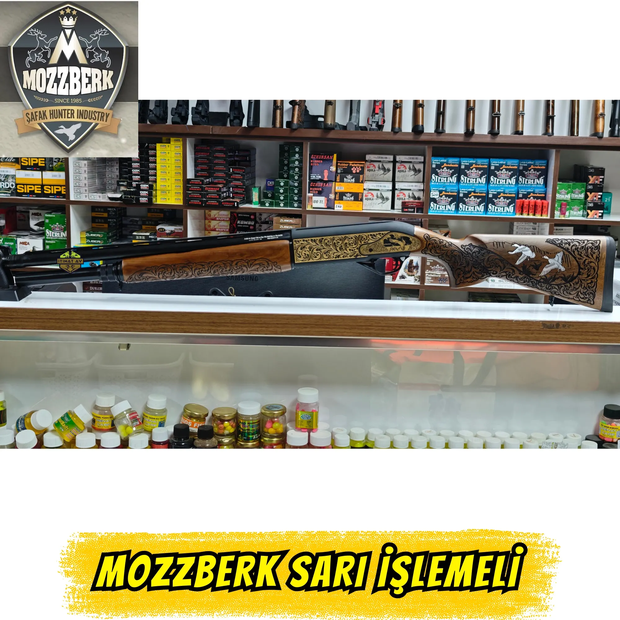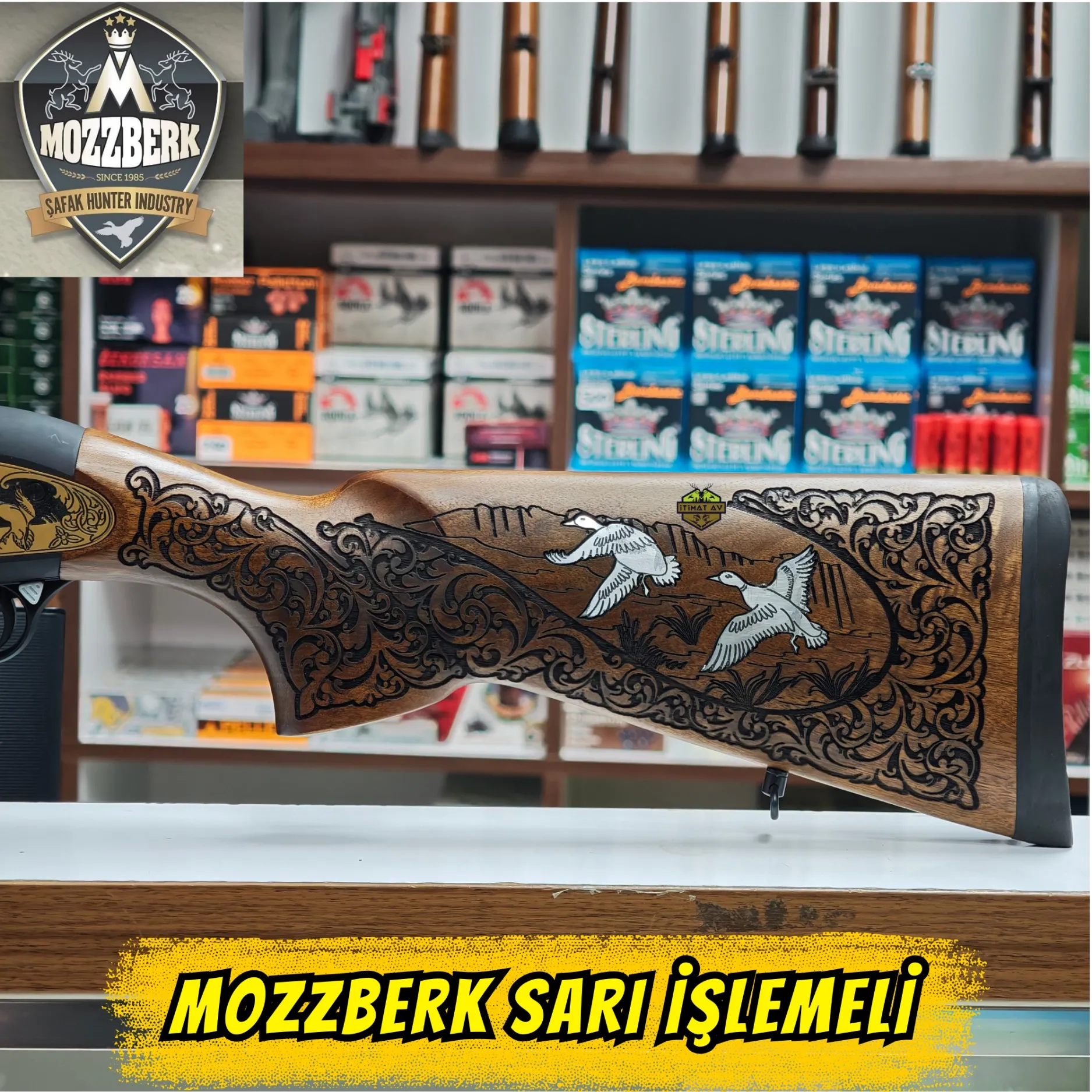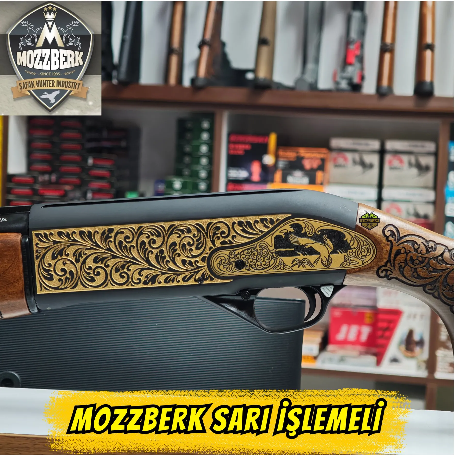 Sanat ve Gücün Muhteşem Uyumu! Şafak Silah Sanayi imzalı Mozzberk, 1040 çelik üzerine işlenmiş sarı (altın) kaplaması ve gümüş-beyaz ördek gravürleriyle göz kamaştırıyor. 51 cm 4140 çelik namlusu ve 7+1 yüksek kapasitesiyle hem taktik hem de avcılık beklentilerini karşılıyor. Alev gizleyenli tasarımı ve seçkin ceviz ahşap kundak yapısıyla hem poligonun hem de doğanın en dikkat çeken tüfeği olmaya aday.