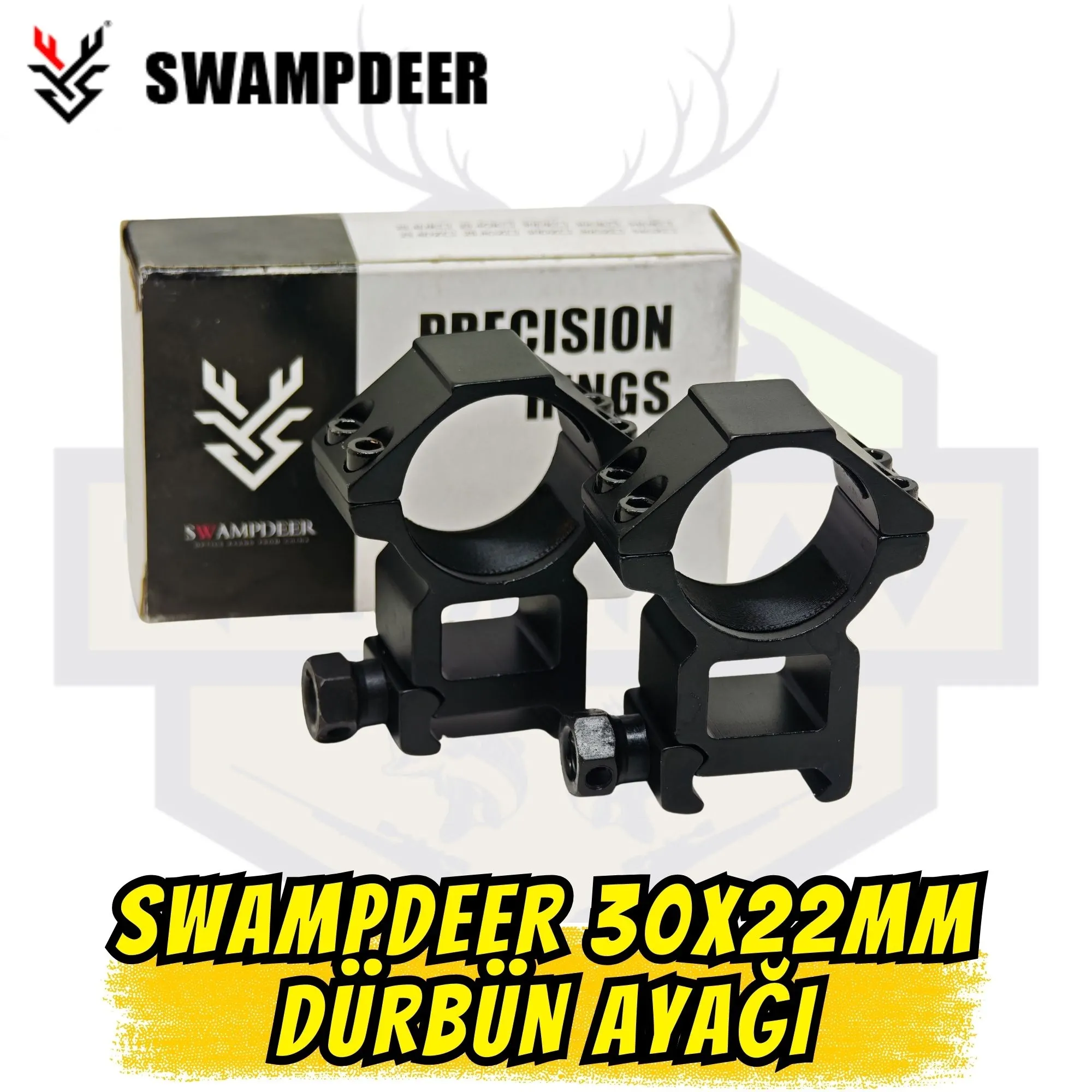 # YÜKSEK PERFORMANSLI OPTİKLER İLE TAM UYUM Günümüzde kullanılan üst segment dürbünlerin çoğu 30mm gövde yapısına sahiptir. Swamp Deer 30mm x 22mm ayak seti, bu büyük optikleri sarsıntısız bir şekilde kavrar. İki parçalı tasarımı sayesinde, dürbün kulelerinin ray üzerindeki konumuna bakılmaksızın esnek montaj imkanı tanır.