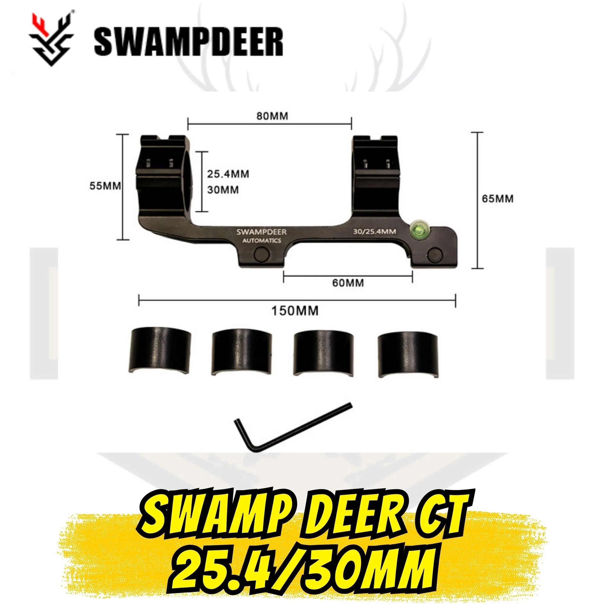 # TEKNİK DETAYLAR • Marka / Model: Swamp Deer CT • Toplam Uzunluk: Yaklaşık 15 cm • Toplam Yükseklik: 6.5 cm • Halkalar Arası Mesafe: 8 cm • Ray Uyumu: 22 mm Picatinny / Weaver • Uyumlu Dürbün Çapları: 25.4 mm (1") ve 30 mm • Ekstra Özellik: Entegre Su Terazisi + Üst Ray