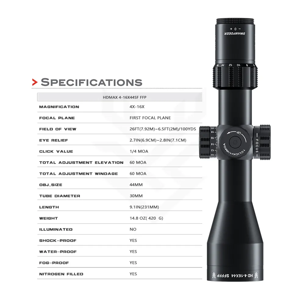 Swampdeer HD MAX 4-16x44 SF FFP Kompakt Tüfek Dürbünü (Sadece 23cm - Ultra Hafif)