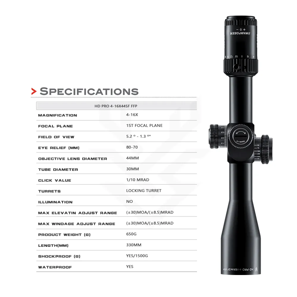 Swampdeer HD PRO 4-16x44 SF FFP Taktikal Tüfek Dürbünü (1500G Darbe Dayanımlı)